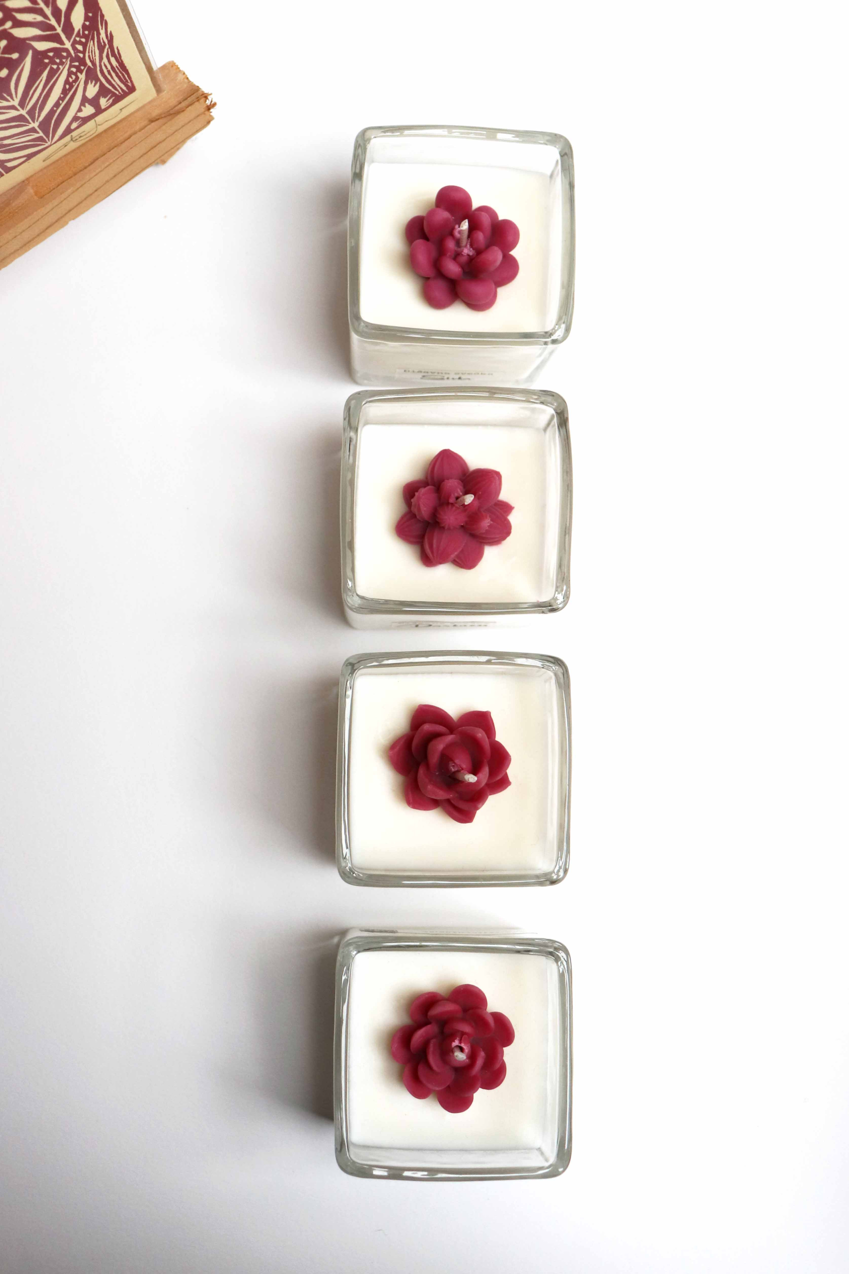 Svečka dimenzije: 6 x 6 x 6 cm, neto teža: 150 g, dišava: Sivka.