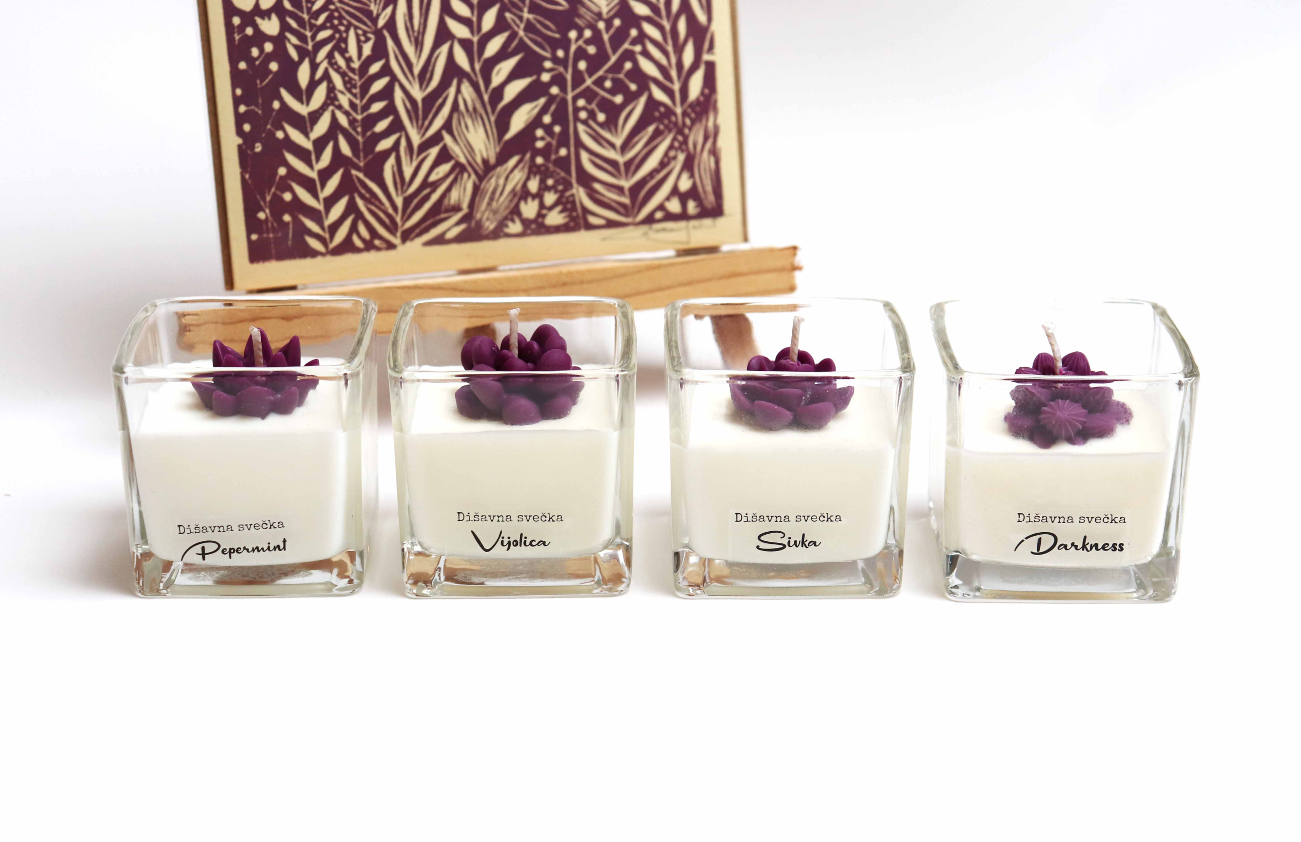 Dišavne svečke v setu so v različnih vonjih, zato je vsak komplet malce drugačen in poseben. Svečka je izdelana iz eko sojinega voska, ki gori čisteje in počasneje, obogatena z eteričnimi olji in skrbno izbranimi omamnimi dišavnimi olji za prijetno, nežno aromo prostora. Svečka je ulita v steklen kozarček, ki je primeren za reciklažo ali ponovno uporabo – kot lonček za shranjevanje ali dekorativen detajl v domu. Naravna izbira za lep vonj in trajnostno noto.